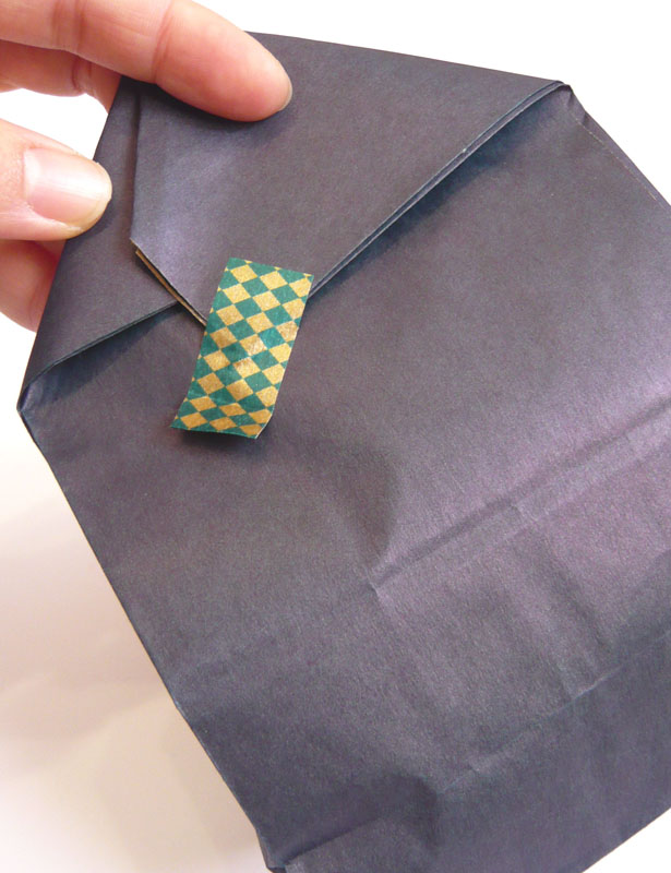角底の紙袋を使った、おうちの形のラッピング。